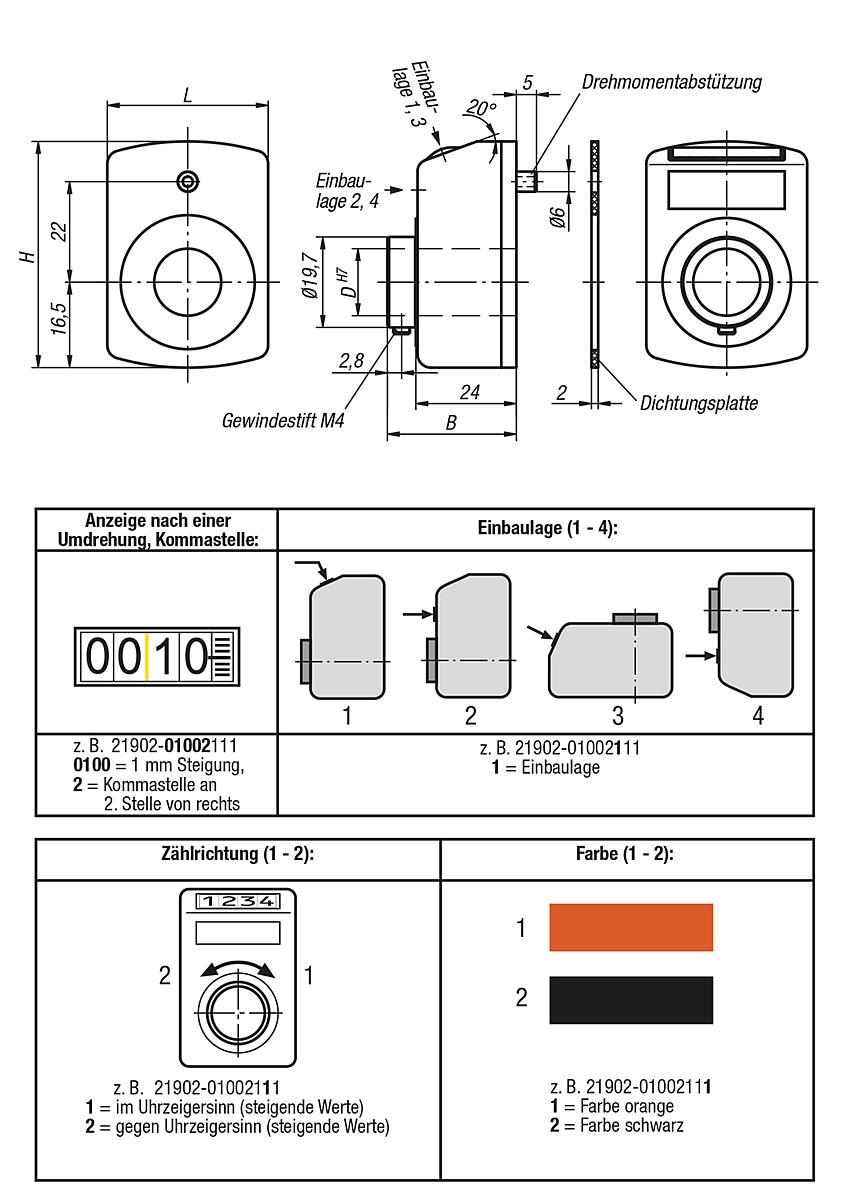 (Positionsanzeiger mit 1 mm Steigung, Komma an 2. Stelle von rechts, Einbaulage 1, Zählrichtung im Uhrzeigersinn steigend, Farbe orange)
